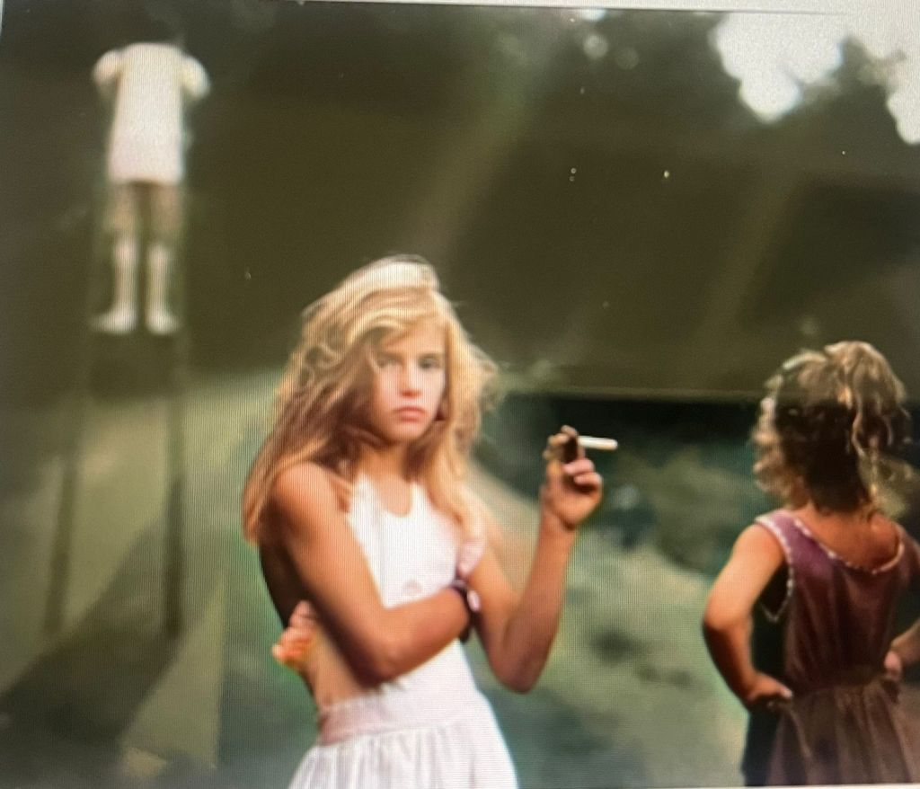 The first thing that stands out is the young girl holding the candy cigarette.The contrast between the innocent face of the child and the provocative item she’s holding is striking.The main character is Jesse, the photographer’s daughter.The clothing worn by the subject, Jessie, is casual and simple, adding to the natural and unpretentious feel of the image. The candy cigarette she holds serves as a significant prop, drawing attention to the theme of childhood innocence contrasted with the imitation of adult behavior. The environment looks like a backyard or outdoor environment, featuring natural light and a casual atmosphere.The physical environment looks like a natural outdoor environment. The exact location is not specified, but it appears to be a backyard or an open outdoor area with natural light. The presence of trees and foliage in the background suggests an intimate and intimate outdoor setting, adding to the authenticity and openness of the overall photo. By utilizing this natural environment, you can create a sense of lightness and spontaneity, enhancing the expression of childhood’s unfiltered moments of reality.