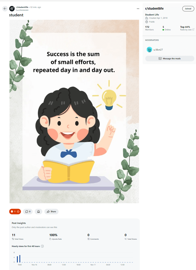 Reddit, on the other hand, was even more challenging. Unlike Instagram, Reddit focuses on meaningful discussions, and engaging with its audience felt harder because the platform’s interaction levels were much lower for my niche content. Finding ways to make my posts more relatable and encourage discussions required a lot of effort and experimentation.