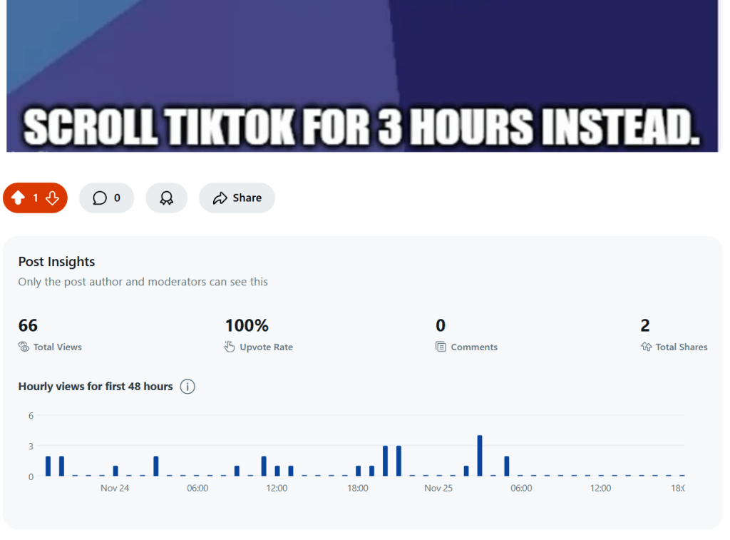 I thought this humorous take would resonate with Reddit users, particularly in the r/studentlife subreddit. However, the response was quite different from Instagram. While the meme received 66 likes and 2 shares, no one commented on it, and the overall engagement was minimal compared to the reel’s performance on Instagram.