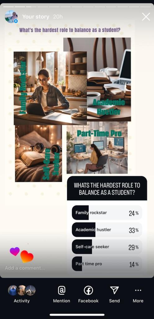 In developing my StudentLifeBalance persona, I drew on classroom insights about performative and mediatised personas to authentically connect with students facing academic and personal challenges. The performative persona concept (07_BCM 241) helped me craft an identity that was intentionally relatable and supportive, allowing me to perform the role of a student who understands the struggles of balancing school and mental health. The mediatized persona idea (07_BCM 241) led me to adapt StudentLifeBalance for different platforms: on Instagram, where visuals dominate, I focused on polished and aesthetic content, while on Reddit where text and humor are more prominent, I shared memes and casual posts. This approach helped me reach micro-publics-specific groups of students who could relate to the content, allowing for genuine interaction and a consistent, trustworthy connection (08_BCM 241).
