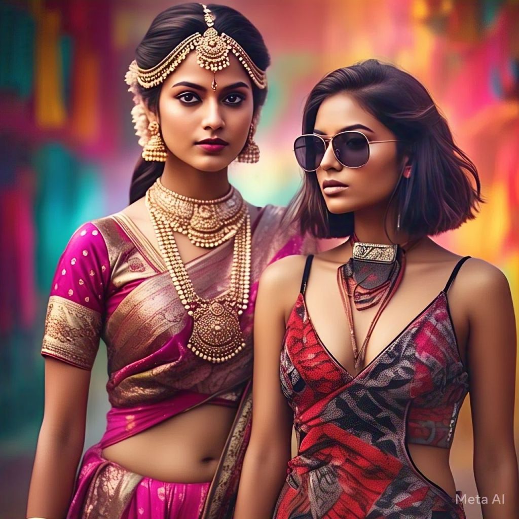Prompt: /imagine an image of a traditional Indian woman in a sari and the contrast of an Indian cubbing woman in very revealing clothes.