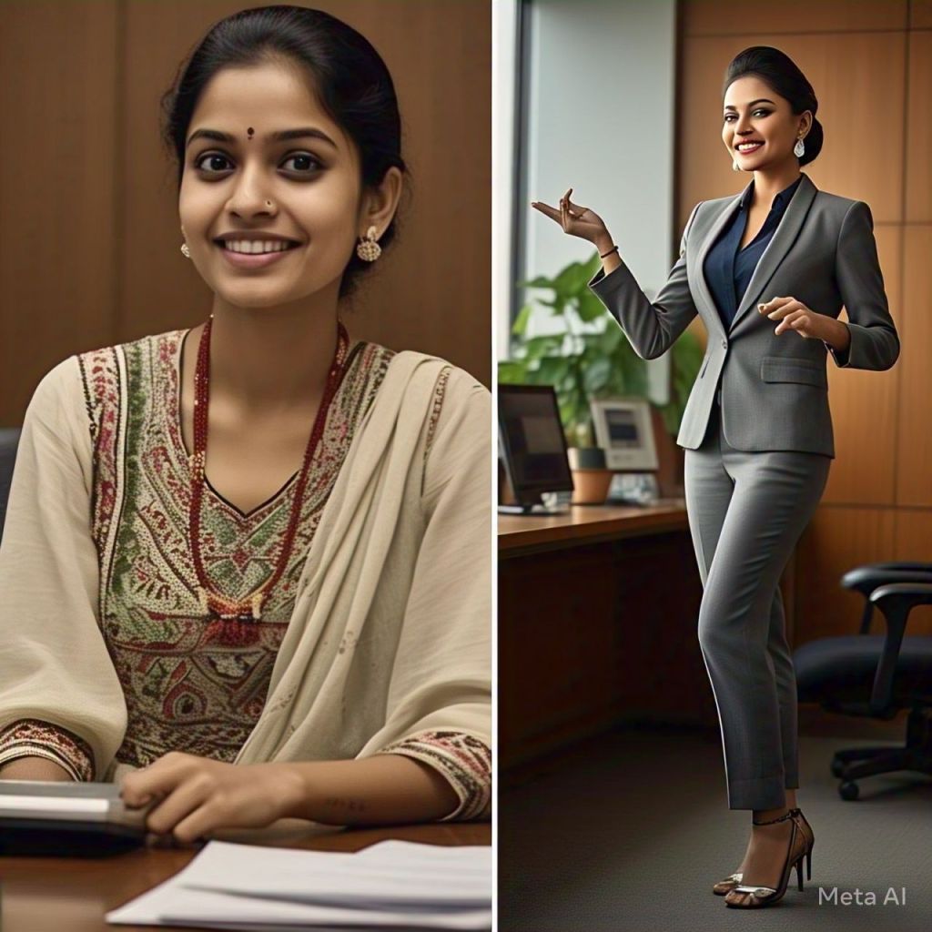 Prompt: \ Imagine the Sanskari woman vs the modern woman side by side, and both are working.