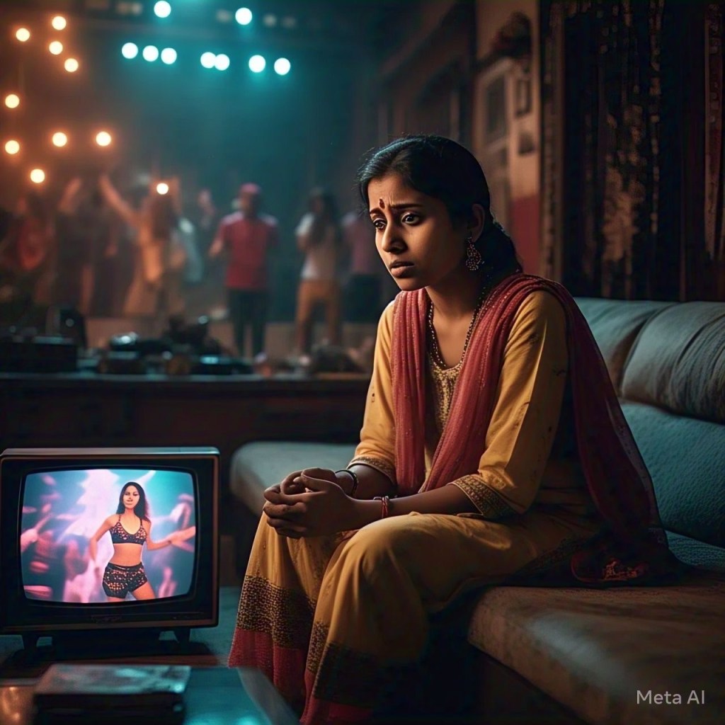 Prompt: /imagine an image of a young stereotypical indian woman being sad while watching an indian woman on TV with revealing clothes.