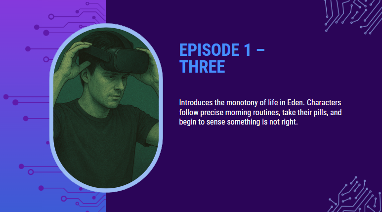 Our dystopian podcast series The Eden Project explores a world where memory, identity, and control are manipulated through technology. Across four connected audio episodes, we take listeners inside a simulation built by an authoritarian system to “protect” humanity after societal collapse. The story follows numbered citizens Two (Batool), Three (Kareem), and Five (Shaeema) as they begin to question their looping lives, their emotions, and eventually the nature of their entire existence. By Episode 4, a government officer named Agent Mira (Sakina) enters the simulation to contain the rebellion only to discover that she herself is part of the same illusion.