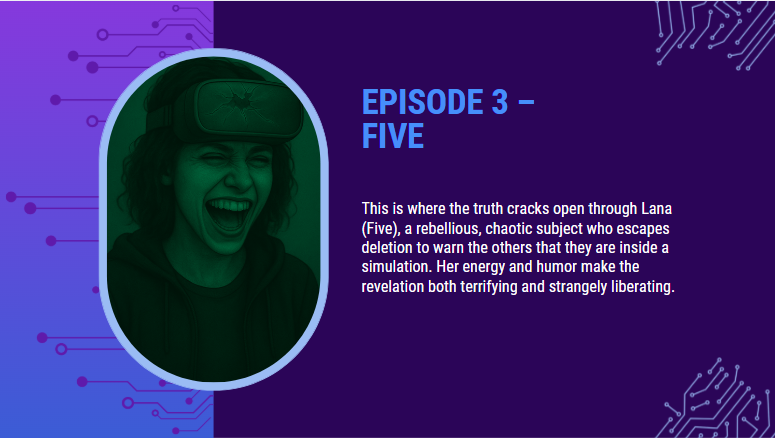 Shaeema took the lead on editing all three episodes and writing the first two. She built the initial sound design and pacing, making the environment feel sterile and controlled. She also developed the character of Lana (Five), drawing inspiration from jinx (Arcane) andLight Yagami (Death Note), blending chaotic emotional intensity with calculated brilliance.