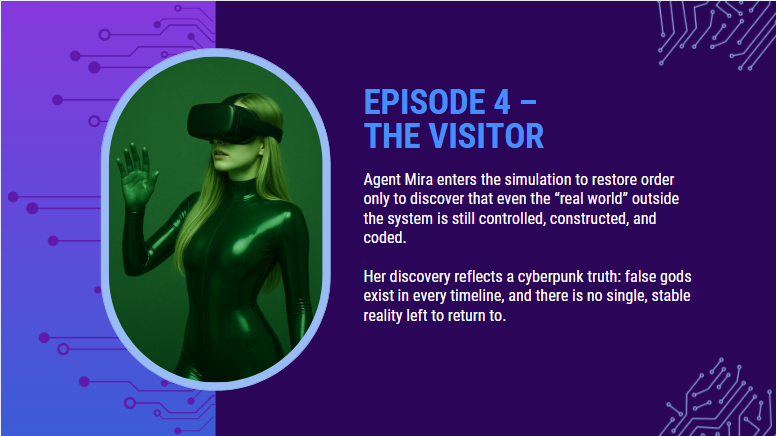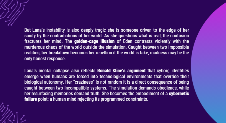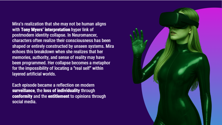 Likewise, Tony Myers’ analysis of Neuromancer emphasizes how identity becomes fractured when consciousness is mediated through artificial systems. This idea informed our portrayal of two fading memory, three mirror glitches, and Lana’s (five) emotional instability. The simulation constantly reframes their reality, pushing them toward psychological disorientation a classic postmodern cyberpunk effect.