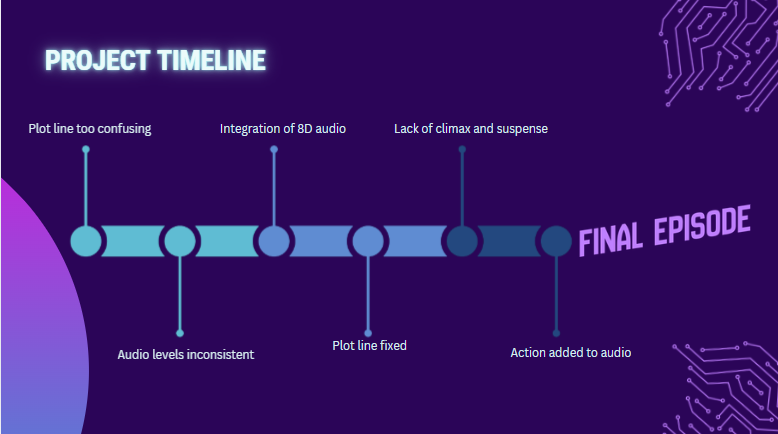 Peer feedback for Episode 3 According to the in-tutorial feedback session, some of Karim(two) & batool’s (three) parts seemed too distant, and the countdown needed more climax. For our final submission we tried to bring karim & batool ‘s voices to the foreground, and build more tension around the countdown.Fixing these taught us how sound position, breath pacing, and volume shape immersion in audio-only storytelling.
